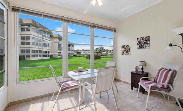 Beautifully furnished first-floor corner unit featuring 2 bedrooms and 2 bathrooms, with tile flooring throughout, impact windows and sliding door leading to a screened Florida room. The open kitchen flows into a spacious living area, and both bedrooms are generously sized, with a walk-in closet in the master. Located in a meticulously maintained community offering a stunning courtyard with tiki huts, a pool, shuffleboard, gym, pool tables, and a library. Conveniently close to shopping, grocery stores, and public transportation.